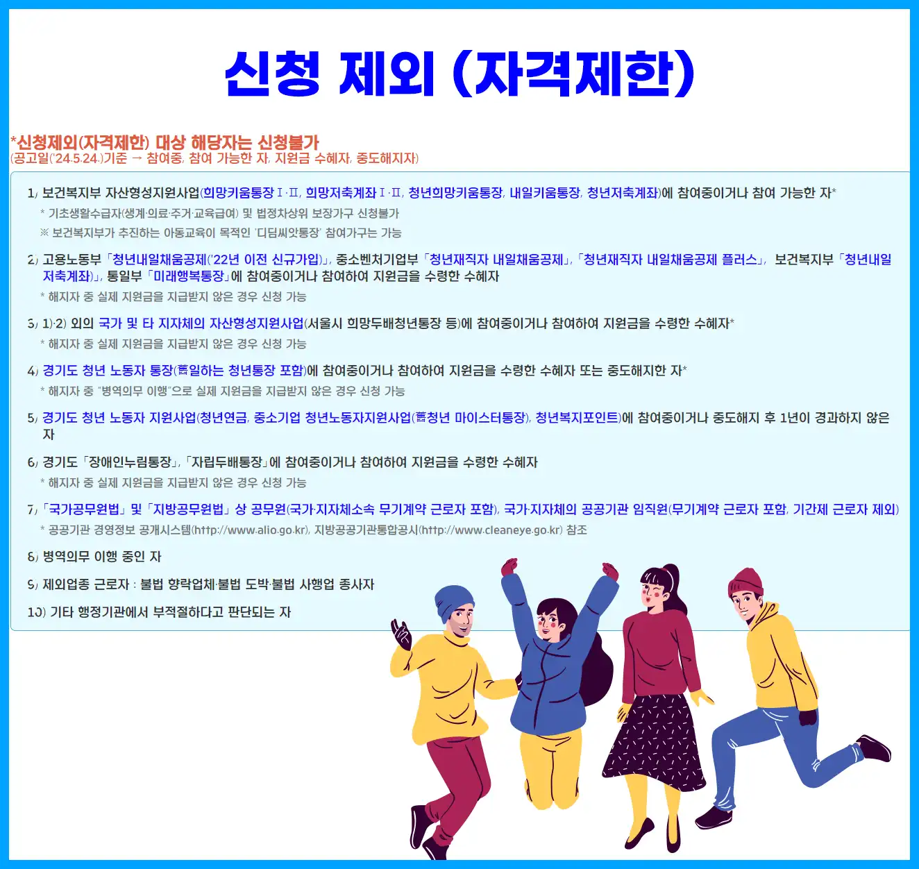 ✔️고용노동부 청년내일채움공제 (22년 이전 신규가입자), 중소벤처기업부 내일채움공제, 복지부 내일저축계좌, 통일부 미래행복통장에 참여 중이거나 지원금을 수령받은 자 (해지자 중 지원금을 받지 않았다면 참여 가능)