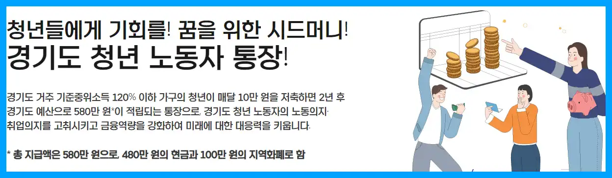 청년 노동자 통장은 경기도에 살고 있는 청년들에게 시드머니를 만들어주기 위한 목적의 통장입니다.