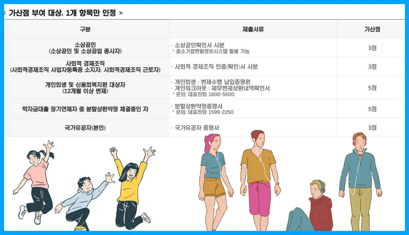 위의 가산점에 해당될 경우, 한 가지의 가산점만 더해지며, 다수의 가산점에 해당할 경우 가장 높은 점수 한 가지만 선정하여 가산점을 더하게 됩니다.