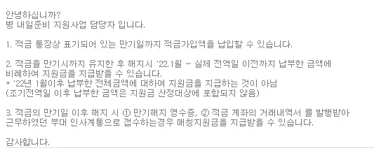 당월 미납시 추가납부하는 방법과 조기전역 시 매칭지원금 금액에 대한 부분들입니다.