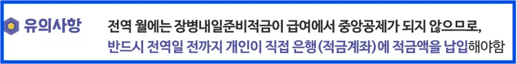 - 10일 이전에 전역을 하는 경우, 전역 하는 달 1일부터 9일 사이에 군적금 계좌로 직접 이체를 하여야 합니다.