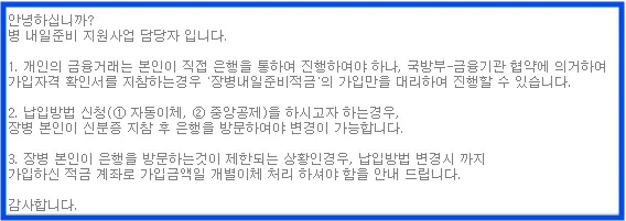 위의 납부 방법 변경 질문과 답변은 국군재정관리단의 공식 홈페이지에 있는 내용을 발췌한 것입니다.