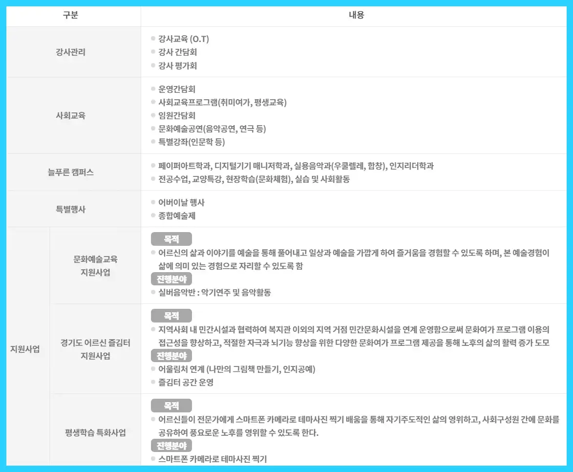 또한 다양한 평생교육프로그램을 통해서 어르신들의 활동을 장려하기도 합니다.