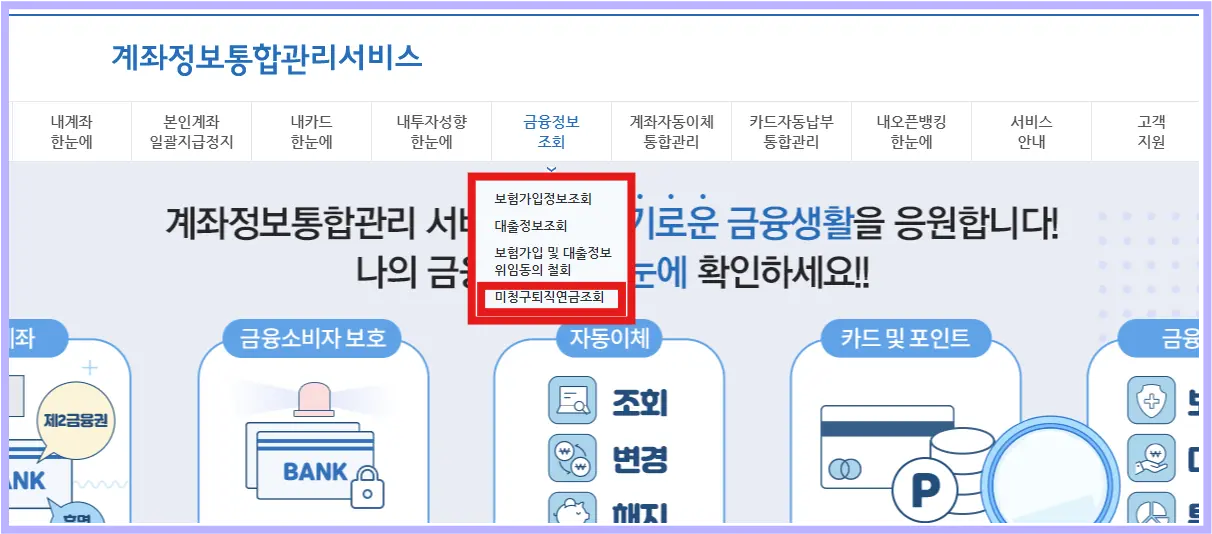 👉어카운트인포 사이트의 금융정보조회 탭에 있는 미청구퇴직연금조회를 클릭하십시오.