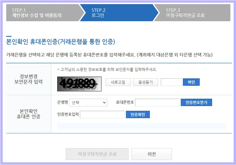 👉인증 후 아래의 미청구퇴직연금 조회 버튼을 누르면 다음으로 이동합니다.