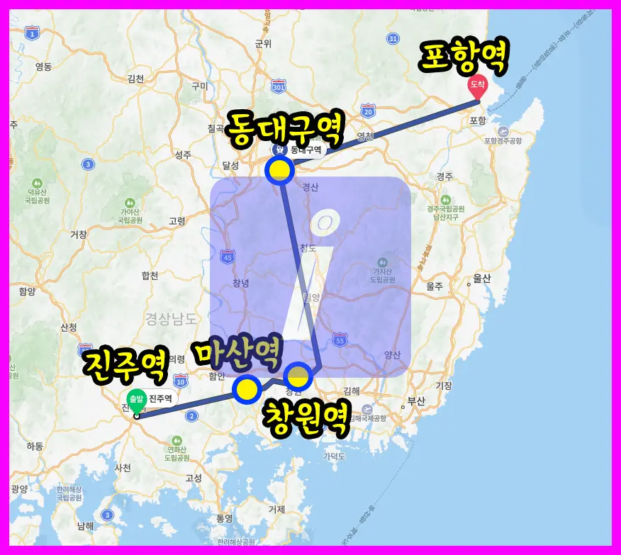 마산역(6시 37분), 창원역(6시 43분), 창원중앙역(6시 52분)을 거치게 됩니다.