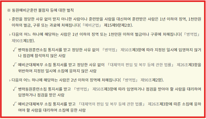 불참시 처벌 | 무단 불참시 병역법에 따라 고발 조치 |