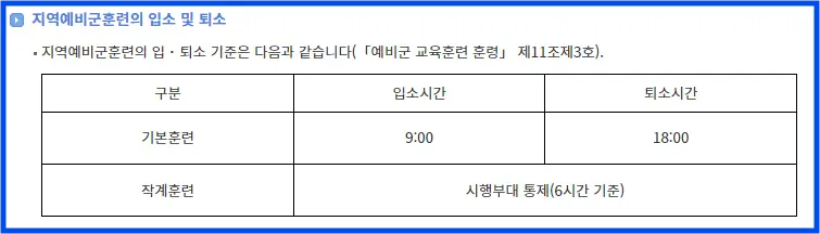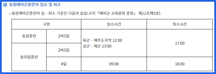 ✔️ 입소 시간 : 2박 3일일 경우 동원훈련과 동일, 4일 일경우 09:00