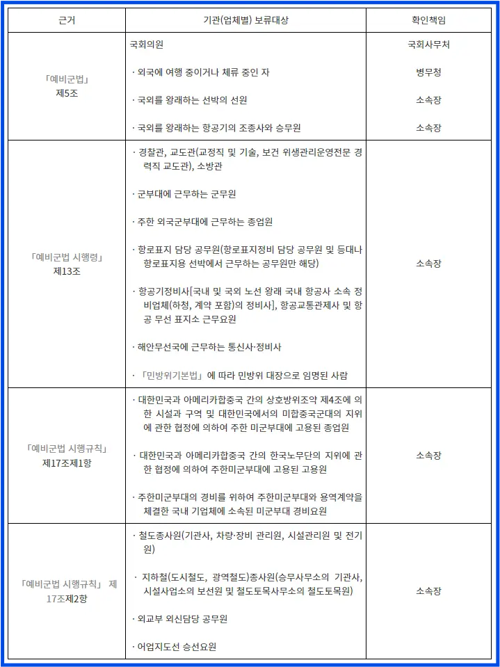 다음과 같은 사유가 있는 사람의 경우 구비서류를 제출하면 예비군 훈련을 연기할 수 있습니다. (「예비군 교육훈련 훈령」 제24조 및 별표 4)