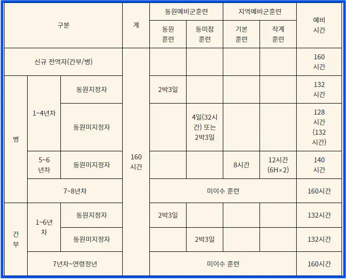 ✔️ 1~4년 차 : 동원 훈련 2박 3일, 동미참 훈련 4일 또는 2박3일