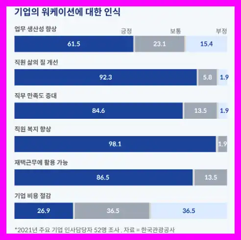 직원들의 직무 만족도 증대(85%), 복지향상(98%), 직원 삶의 질 개선(92%) 에 도움이 된다는 조사 결과가 있습니다.
