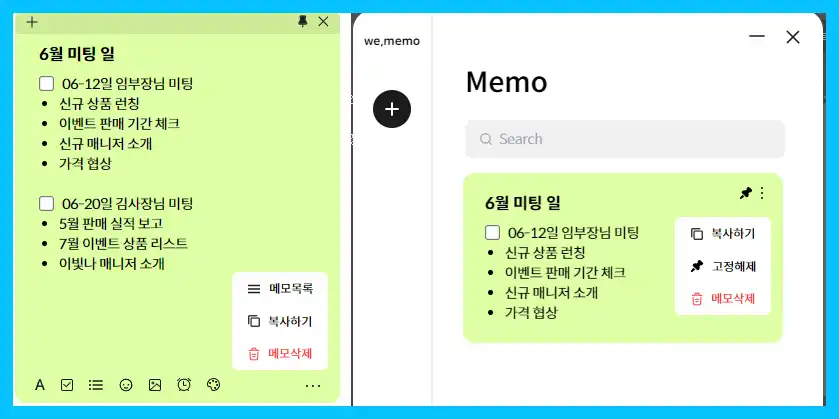 메모 복사와 마찬가지로 메모, 메인ui 창 두 곳에서 다 사용할 수 있습니다.