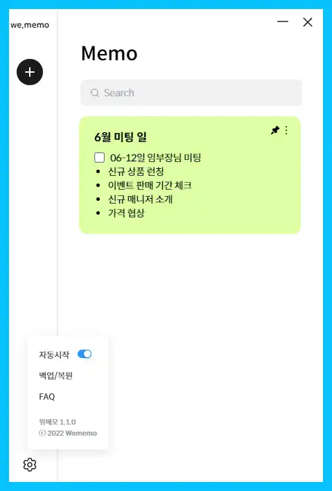 자동시작은 pc를 새로 On 하게 되면, 자동으로 위메모가 시작이 되어 메모에 적힌 일정을 확인할 수 있습니다.