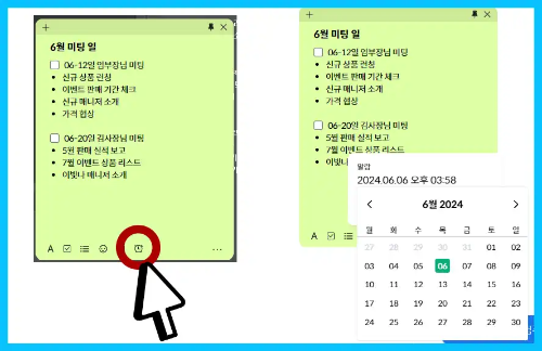 알람을 설정하고자 하는 메모의 아래에 있는 시계 아이콘을 클릭하고 원하는 날짜, 시간을 차례로 설정해주면 알람 설정이 완료됩니다.