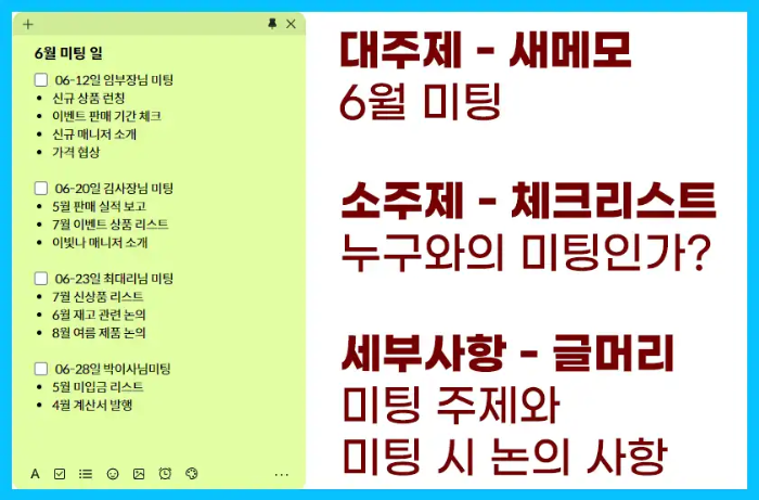 예를 들어 6월에 미팅 일정이 잡히면, 미팅이 하나의 대주제이기 때문에 새 메모를 생성합니다.