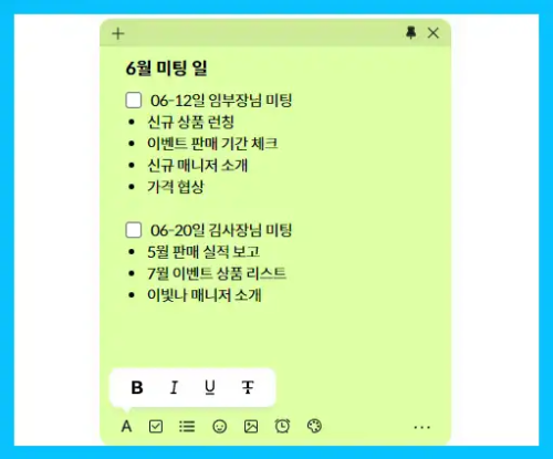 소주제는 김사장님 미팅, 최대리님 미팅, 임부장님미팅, 박이사님미팅 이렇게 4개로 체크리스트를 사용하고, 미팅 날짜를 함께 적습니다.