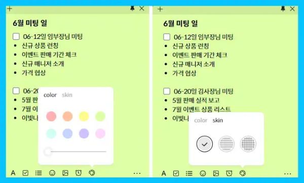 메모지의 색상과 스킨, 투명도를 변경할 수 있는 기능입니다.