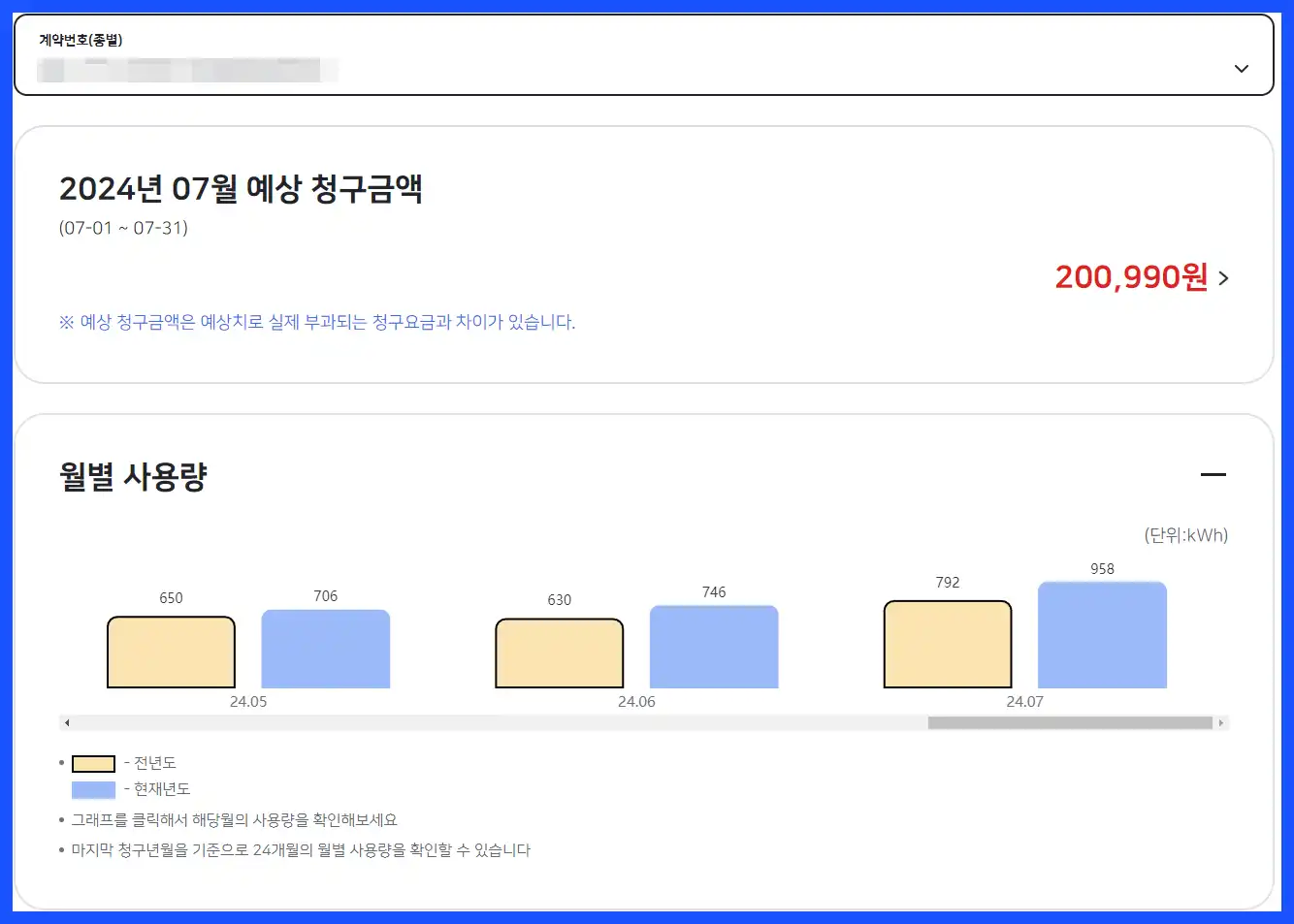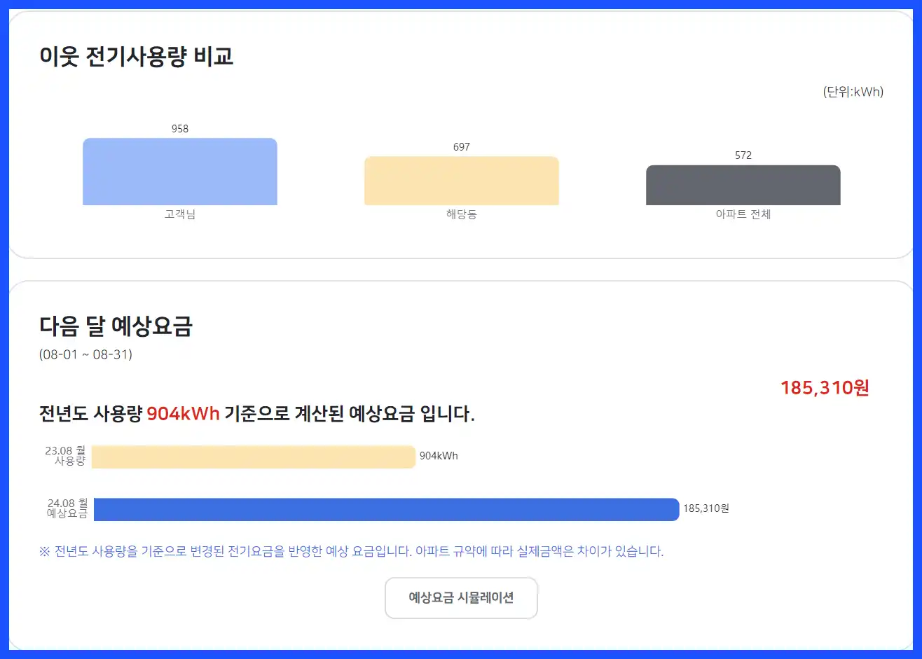 작년에 사용한 양을 올해에도 사용할 경우, 예상되는 전기요금도 표시해 줍니다.