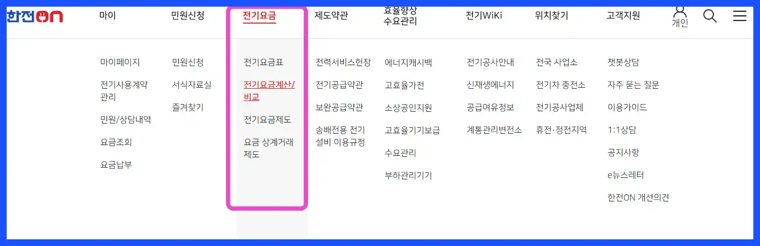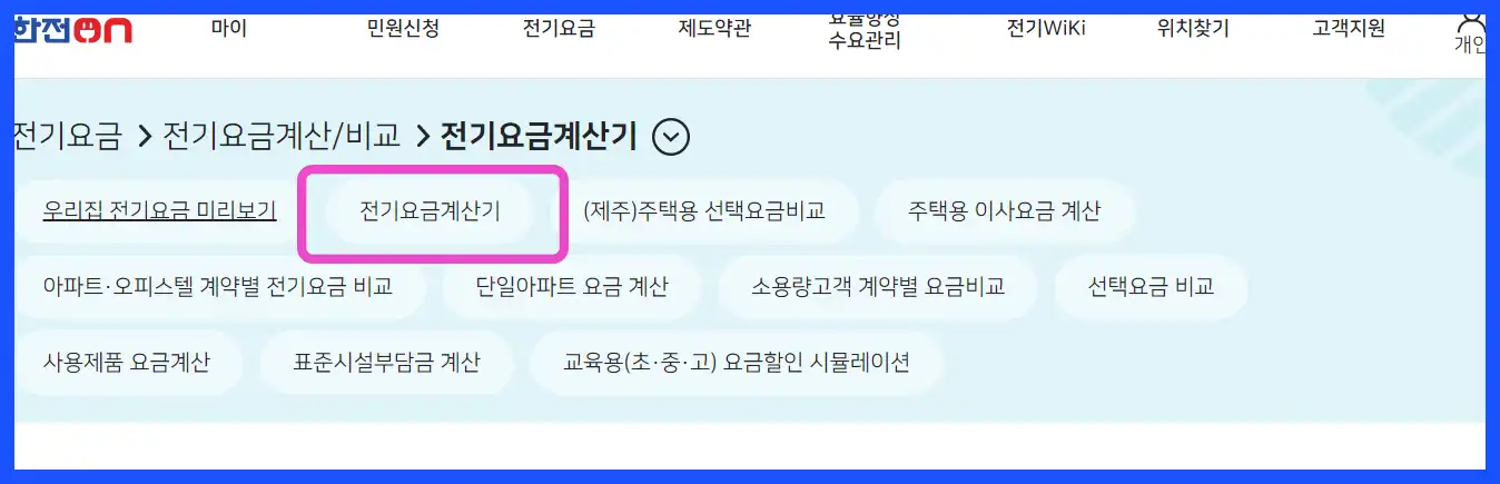 아래 그림에 나와 있는 탭으로 들어가서, 전기요금계산/ 비교를 클릭해 보세요.