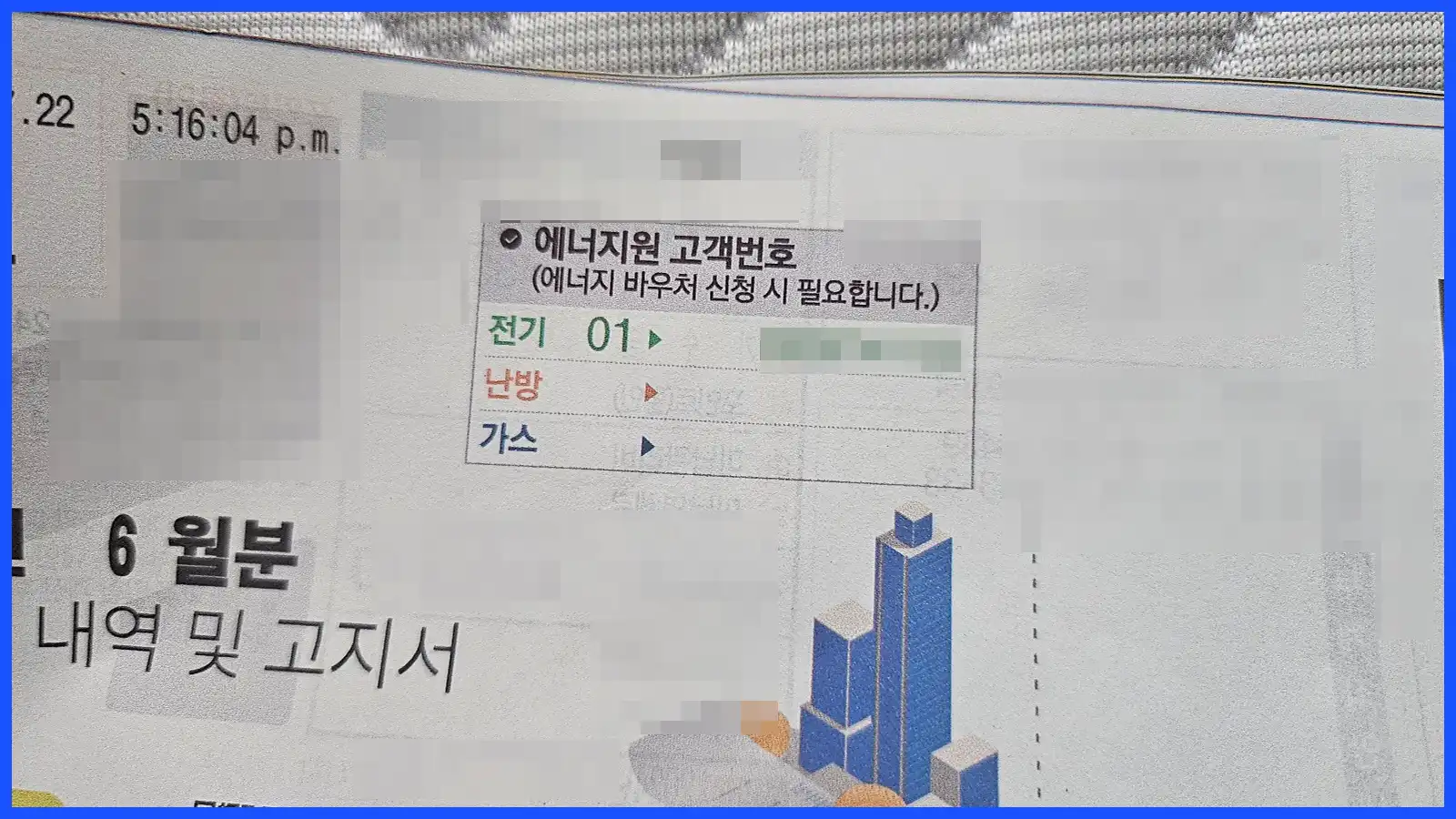 아파트의 경우 관리비 고지서에 에너지원 고객번호가 명시되어 있습니다.
