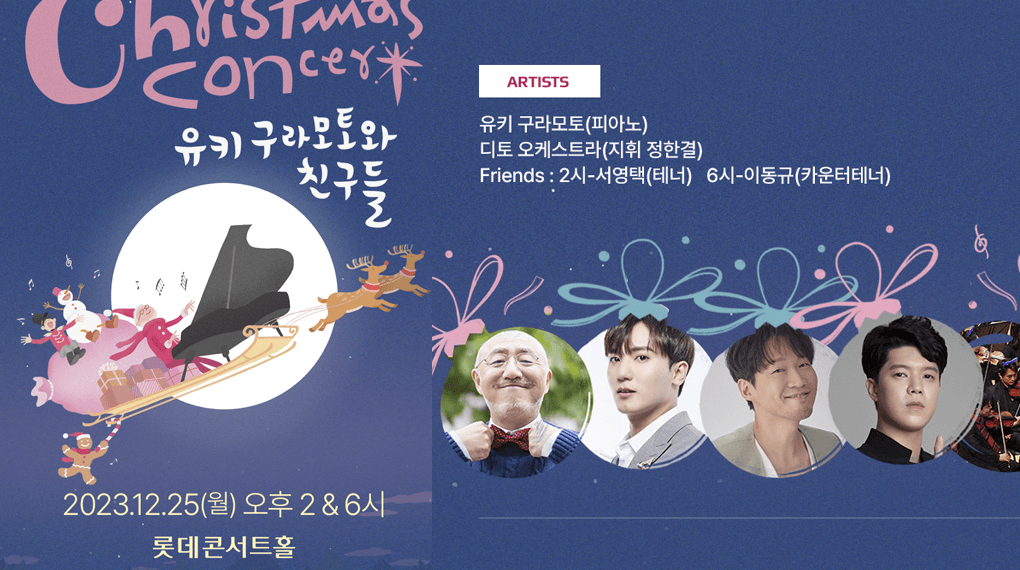 유키 구라모토의 크리스마스 콘서트 12월 25일 공연으로 롯데콘서트 홀에서 공연됩니다.