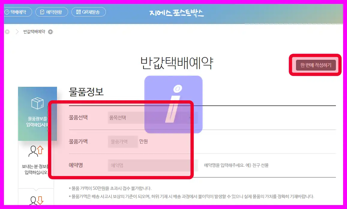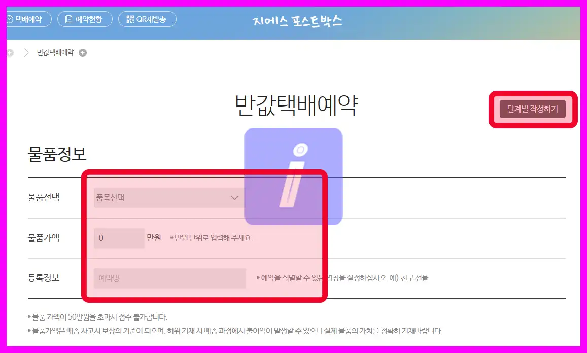 - 반값택배예약(단계별 작성하기 또는 한꺼번에 작성)→비번기억하기