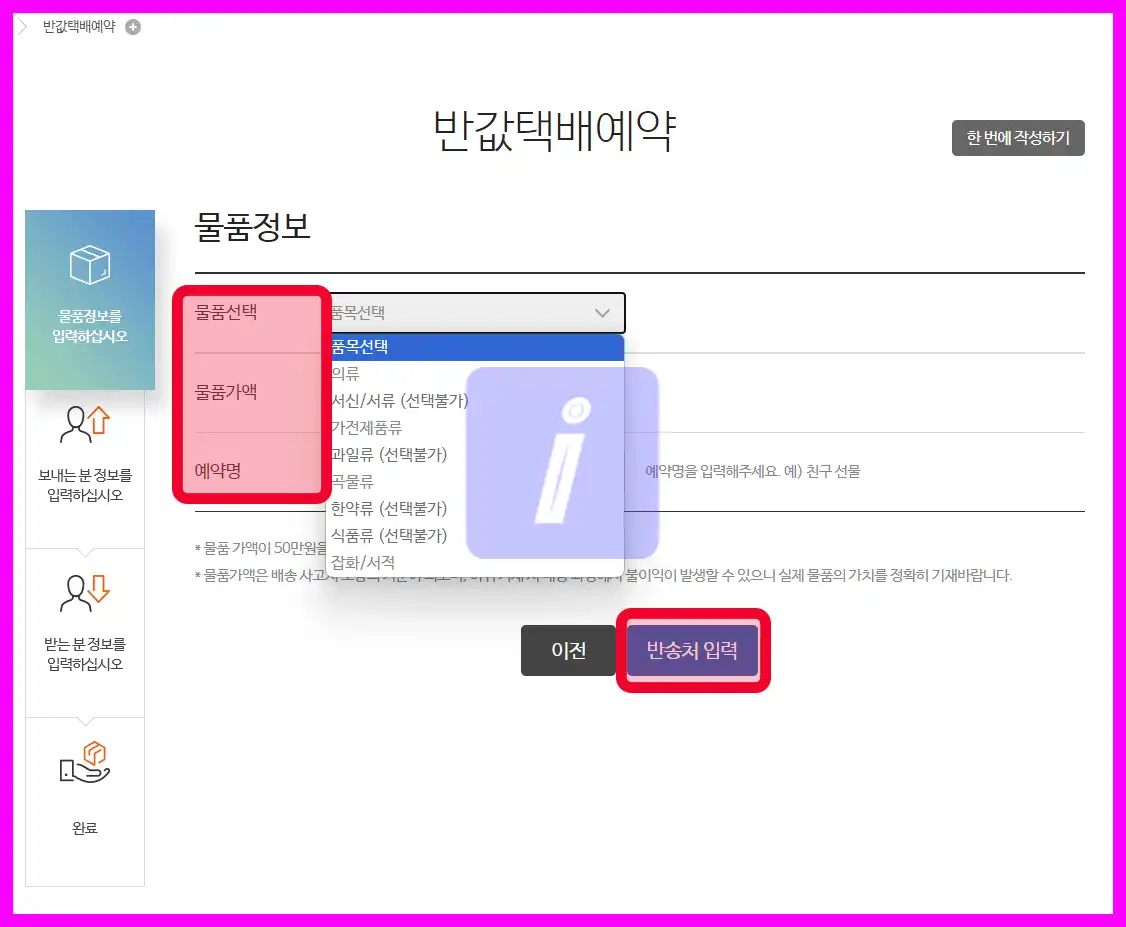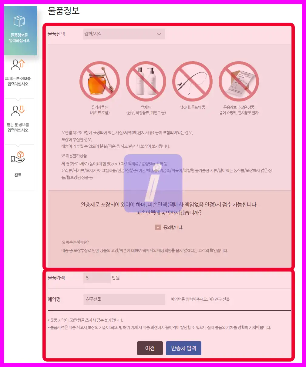 물품가액과 예약명(아무거나 가능)을 입력하고 반송처 입력 버튼을 눌러서 다음단계로 이동합니다.