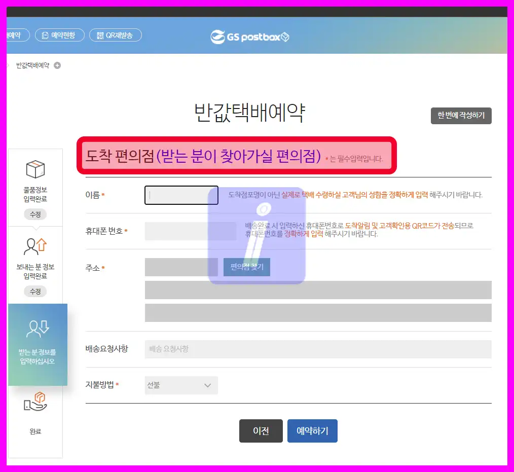 도착 편의점은 제품이 도착할 GS25 편의점 주소를 입력하는 단계입니다.