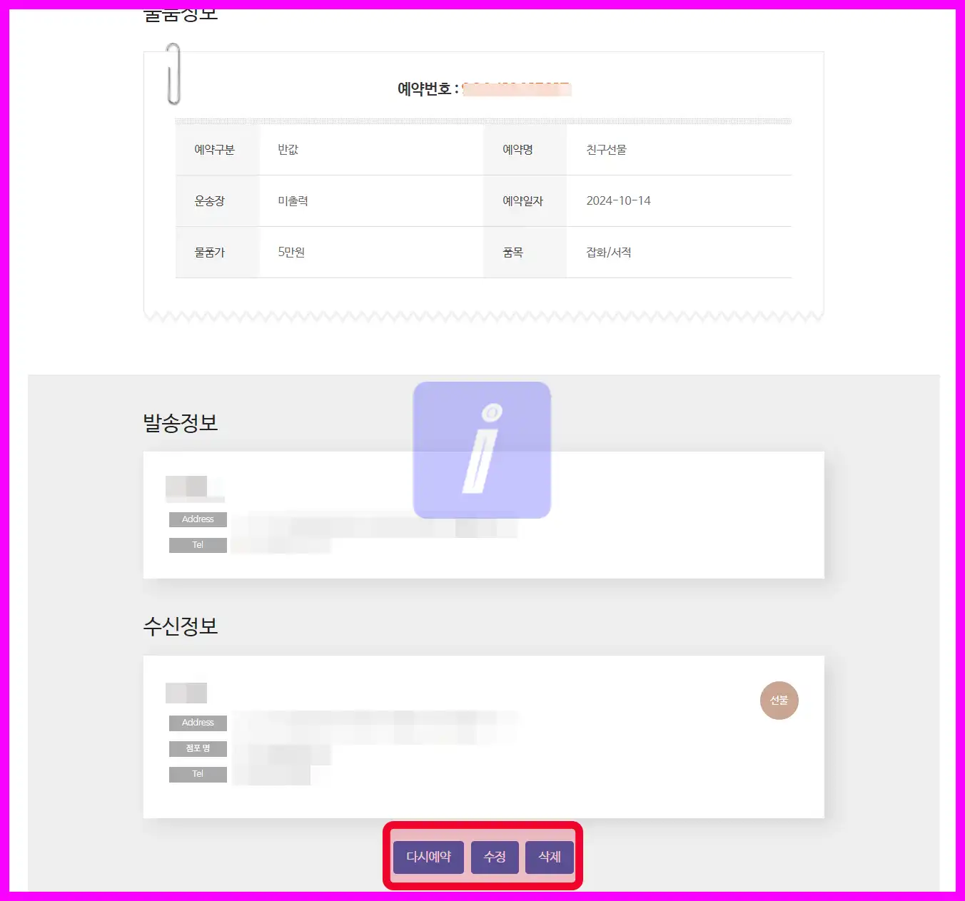 예약한 택배의 수취인 정보와 물품 등을 수정할 수 있고, 예약 자체를 삭제할 수도 있습니다.