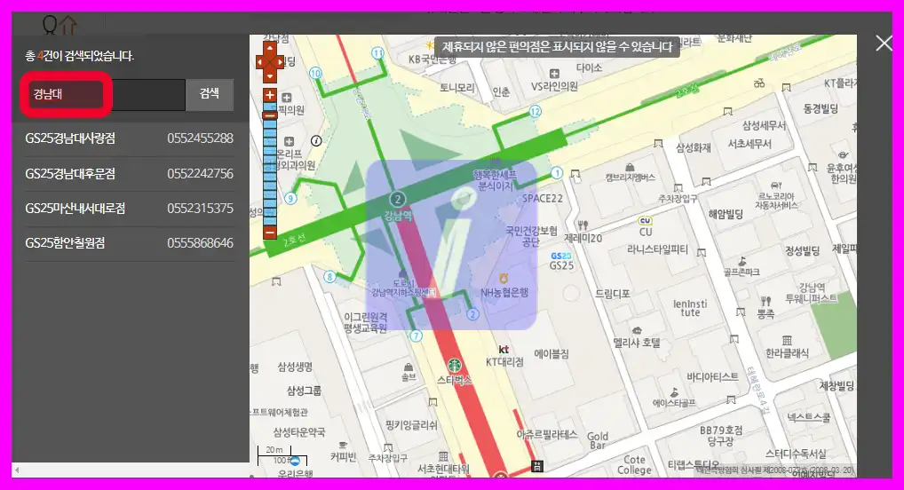 도착 편의점의 이름을 입력하고, 도착지 편의점의 위치를 지도에서 선택해 줍니다.