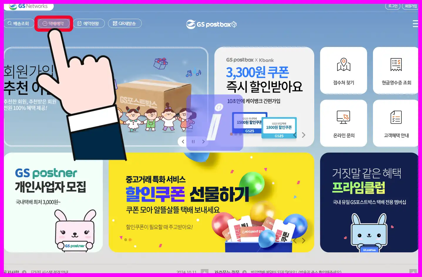 홈페이지 첫 화면 상단에 있는 택배예약 버튼을 클릭하면